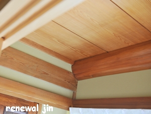 細い木を狭い間隔で並べた「おさ欄間」や、 採光部分のある「源氏ふすま」にも職人の技が光る和室 |